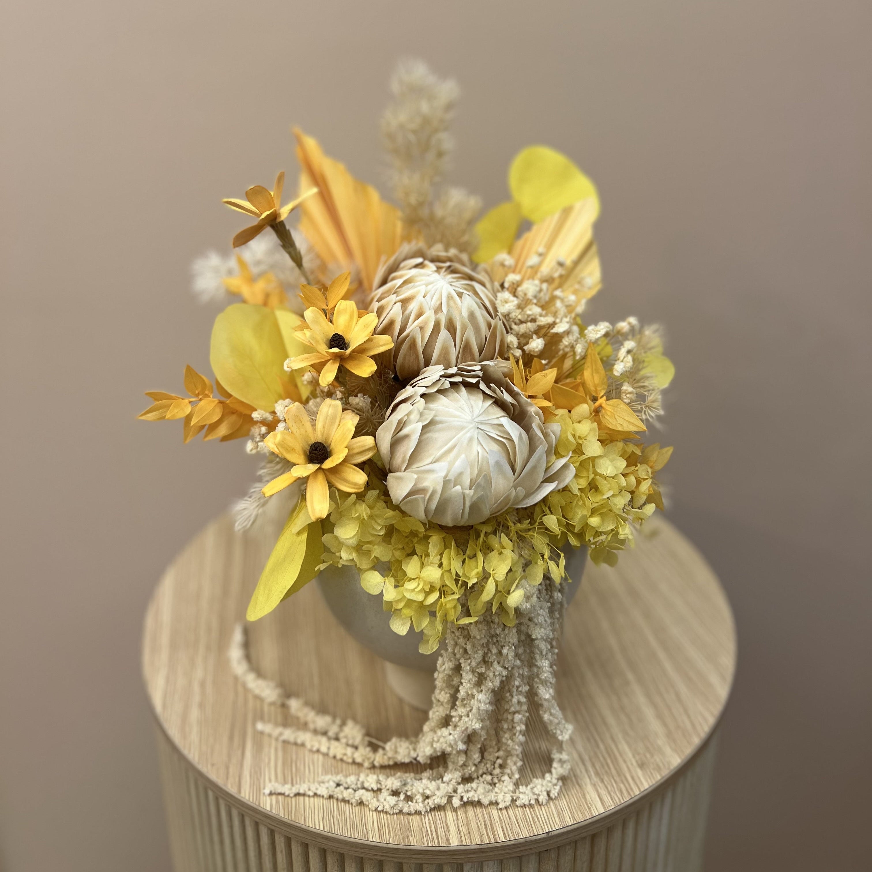 Bright yet soft, this arrangement blends cheerful yellow tones with creamy neutrals for a fresh and uplifting design. Presented in a stylish keepsake pot, it’s the perfect way to bring a touch of warmth and lasting beauty into any space.