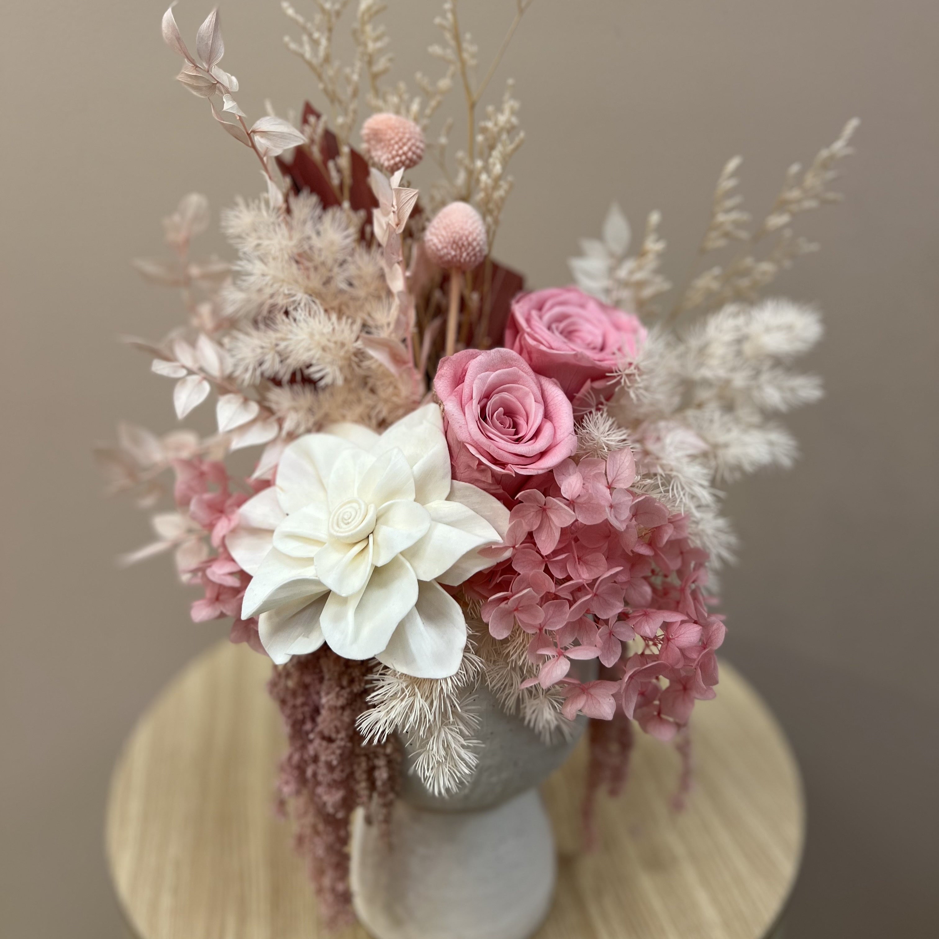 Delicate and timeless, this one-of-a-kind arrangement combines soft pink and crisp white dried blooms for a fresh, romantic look. Presented in a stylish keepsake pot, it’s designed to add a touch of beauty to any room while lasting for years to come.