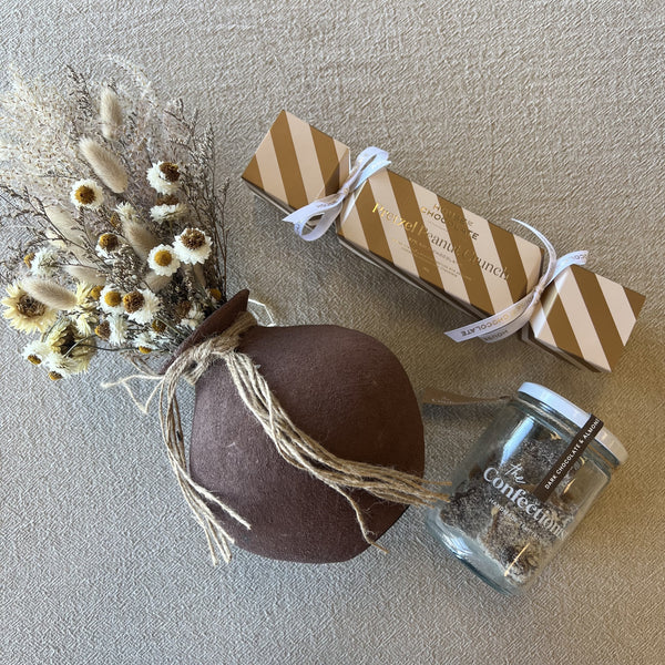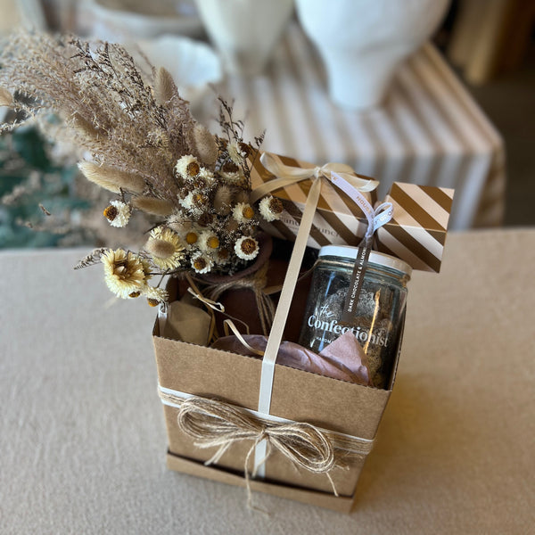 The perfect gift for any occasion, this gift pack contains... Neutral Dried Floral ArrangementĀ  Sahara Organic Brick VaseĀ  The Confectionist Dark Choco & Almond Toffee House Of Choco Pretzel Peanut...