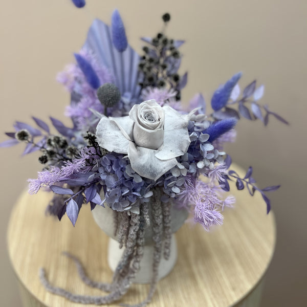 This one-of-a-kind arrangement features a stunning selection of mauve-toned dried flowers, styled to highlight soft, muted beauty. Set in a modern white cement ribbed keepsake pot, it brings an elegant...