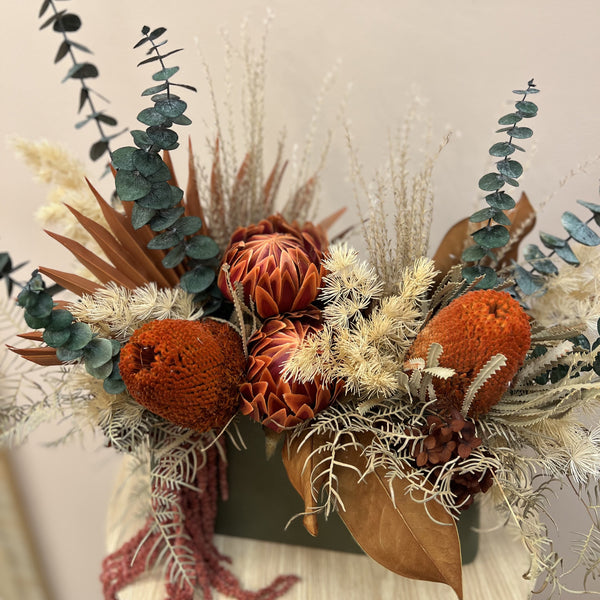 Rich and earthy, this arrangement combines deep burnt oranges with dark greens and soft neutral tones, creating a striking piece full of warmth and texture. Styled in a modern keepsake...