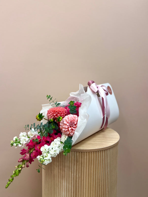 Enjoy our divine seasonal Carry Bag created with fresh seasonal blooms and foliage. So convenient to transport and to then put straight into a vase at home! All blooms come...