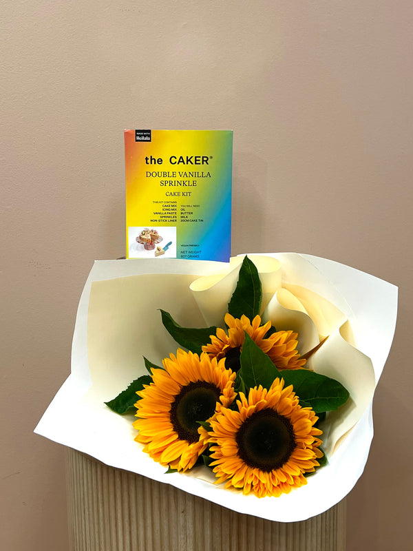 Bring a little sunshine into your kitchen with our Bake & Bloom Box! This cheerful bundle includes three fresh stems of sunflowers, beautifully gift wrapped, alongside a Caker Kit in...