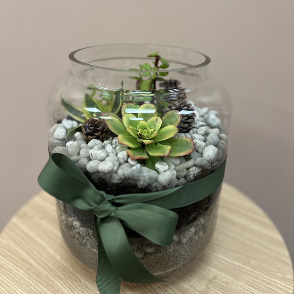 Bring a touch of nature indoors with our beautifully crafted Succulent Terrarium. Designed in a clear glass vessel, this miniature garden features an artful selection of hardy succulents, textured stones,...